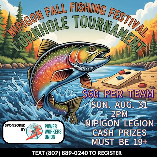 Come out and show off your cornhole skills at the Nipigon Fall Fishing Festival Cornhole Tournament! Grab a partner and get ready for a fun-filled afternoon on August 31st at 3 PM at the Nipigon Legion. With a $60 entry fee per team, you'll be competing for cash prizes. Don't miss your chance to be crowned the cornhole champions! To register, text (807) 889-0240. Participants must be 19+.