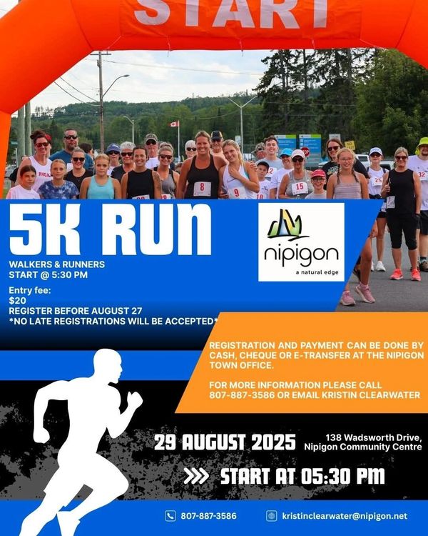 Lace up for the Nipigon Fall Fishing Festival 5K walk/run! This fun event kicks off on Friday, August 29, at 5:30 p.m. Whether you're a seasoned runner aiming for a personal best or prefer a leisurely stroll, it's a great way to enjoy the beautiful scenery and get some exercise.