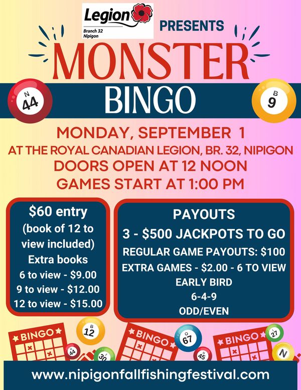 Don't miss the 60th Annual Nipigon Fall Fishing Festival Monster Bingo on Monday, September 1! The fun starts at 1 p.m. with doors opening an hour early at 12 noon, so you can get a good seat. This is your chance to win some amazing cash prizes while celebrating a long-standing community tradition. Come on down and try your luck!