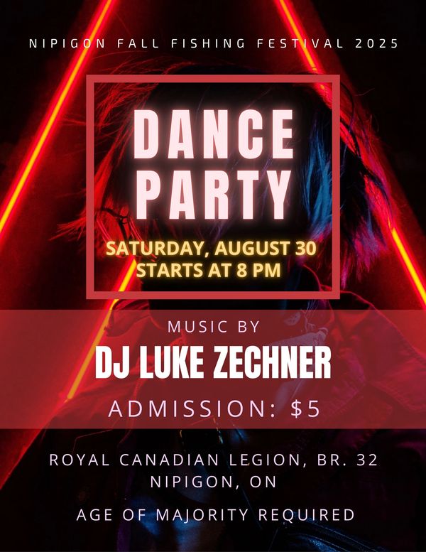 Get ready to hit the dance floor on Saturday night at the Nipigon Fall Fishing Festival Dance Party! Join the party at the Royal Canadian Legion, Branch 32, for a night of music with DJ Luke Zechner. This is an age of majority event, with dancing starting at 8 PM. Admission is just $5, making it the perfect way to cap off a day of festival fun. Bring your friends and get ready to dance the night away!