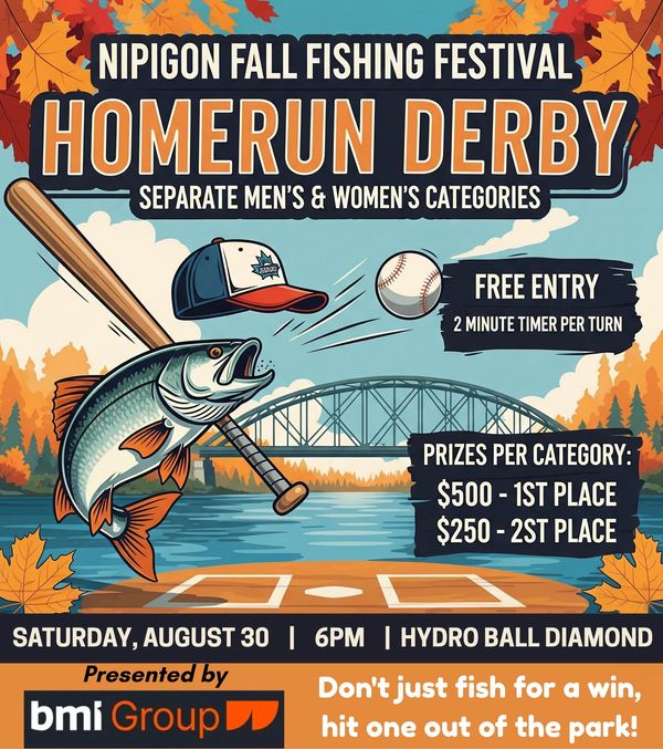 Come out to the Hydro field Ball Diamond on Saturday, August 30 at 6pm for the Nipigon Fall Fishing Festival Homerun Derby! This free-to-enter event features separate men's and women's categories. Prizes will be awarded in each category: 1st place wins $500, and 2nd place takes home $250.