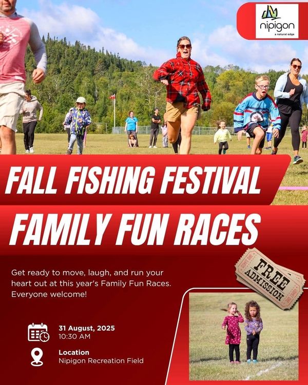 Start your engines and get ready for a morning of laughs and friendly competition! Presented by the Township of Nipigon, the Family Fun Races are part of the Nipigon Fall Fishing Festival on Sunday, August 31, at 10:30 a.m. Head over to the arena field with the whole family, as this event is open to all ages. It's the perfect opportunity to create some lasting memories together!
