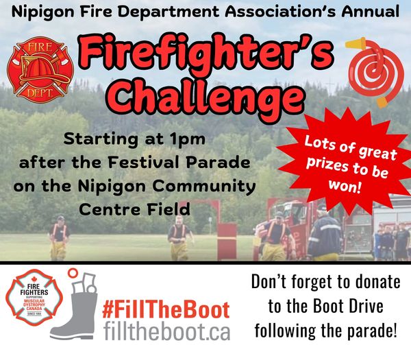 Join the Nipigon Fire Department Association for their Annual Firefighter's Challenge, a fun and interactive event for children. Starting at 1 PM on Saturday, in the arena field, right after the festival parade, kids can put their "firefighting" skills to the test on a special course. This is a great opportunity for young aspiring firefighters to experience some of the challenges first responders face in a safe and enjoyable environment. It's a fantastic way for the community to engage with the local fire department and for children to have a blast while learning about fire safety.