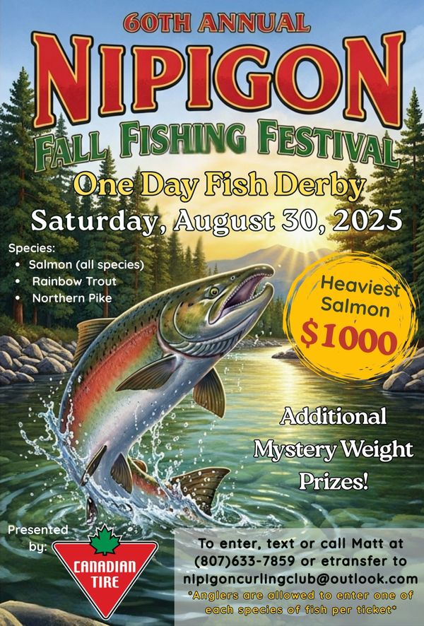 For complete derby rules, visit www.nipigonfallfishingfestival.com. To enter, contact Matt by text or phone at (807)633-7859. Tickets can be purchased in person or via e-transfer at nipigoncurlingclub@outlook.com. This event is proudly presented by Canadian Tire.