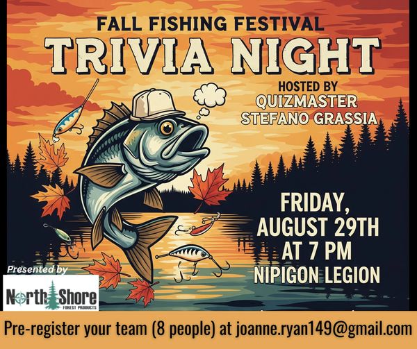 Get ready to cast your lines and bait your brains for the Fall Fishing Festival Trivia Night! Hosted by the legendary Quizmaster Stefano Grassia, this is your chance to reel in some knowledge and compete for bragging rights. Gather your team of 8 people and head down to the Nipigon Legion on Friday, August 29th at 7 PM. Don't get caught without a spot—preregister your team now by emailing joanne.ryan149@gmail.com. This exciting evening is proudly presented by North Shore Forest Products.